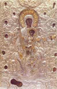 Icono milagroso de la Panaguía Mirovlítisa (emanadora de mirro) «La Raíz de Jesé» en el monasterio de San Nicolás, en la isla de Andros (Grecia)