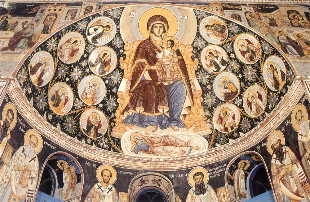 Fresco de la Theotokos «La Raíz de Jesé», representación iconográfica de los antepasados de Cristo, en el monasterio de Vatopedi (Monte Athos)