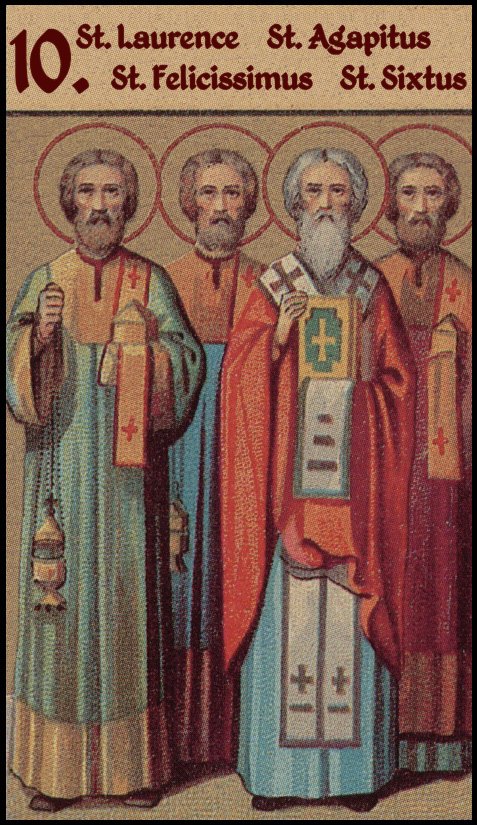 Cuando el papa Esteban fue asesinado (2 de agosto), entonces San Sixto, que era ateniense de nacimiento, fue nombrado en su lugar. Al principio, Sixto era un filósofo y, después, se hizo cristiano. En aquel tiempo, los obispos de Roma eran asesinados uno tras otros, y por eso, convertirse en obispo de Roma significaba ser conducido a la muerte. El emperador Decio estaba determinado a destruir el cristianismo y el papa Sixto fue conducido a un juicio con dos de sus diáconos, Felicísimo y Agapito. Siendo llevados a prisión, Lorenzo dijo al papa: “¿A dónde vas, padre, sin tu hijo? ¿A dónde vas, oh obispo, sin tu archidiácono?”. El papa lo consoló, profetizando a Lorenzo que él padecería incluso mayores torturas por Cristo y que pronto le seguiría. Y de hecho, tan pronto como decapitaron a Sixto y a sus dos diáconos, Lorenzo fue apresado. De antemano, Lorenzo había puesto en orden todos sus asuntos y los asuntos de la Iglesia. Como tesorero y oikonomos (ecónomo) de la iglesia, trasladó todos los objetos de valor a casa del viudo Ciríaco. En otra ocasión, sanó a Ciríaco de un terrible dolor de cabeza tocándolo con sus manos y restauró la vista de un ciego, Crescencio. Conducido a prisión, incluso allí sanó Lorenzo a Lucilio, un prisionero de edad avanzada, de su ceguera, y después lo bautizó. Siendo testigo de esto el carcelero Hipólito, también fue bautizado, y al final sufrió por Cristo (13 de agosto). Puesto que Lorenzo no quería negar a Cristo, y por el contrario, aconsejó al emperador Decio abandonar sus falsos dioses, fue golpeado en la cara con piedras y todo su cuerpo fue golpeado con un escorpión (látigo curvado al final como el aguijón del escorpión), es decir, por una cadena con dientes afilados. Romano, un soldado que estaba presente en la tortura, creyó en Cristo e inmediatamente fue decapitado. Finalmente, pusieron a Lorenzo desnudo en una parrilla y encendieron el fuego. Abrasado por el fuego, San Lorenzo dio gracias a Dios, y se burló del emperador por su paganismo. Después de que Lorenzo entregara su pura y heroica alma a Dios, su cuerpo fue trasladado durante la noche por Hipólito y llevado, al principio, a casa de Ciríaco y más tarde a una cueva donde Hipólito lo enterró honorablemente. San Lorenzo, junto con otros, sufrió en el año 258.