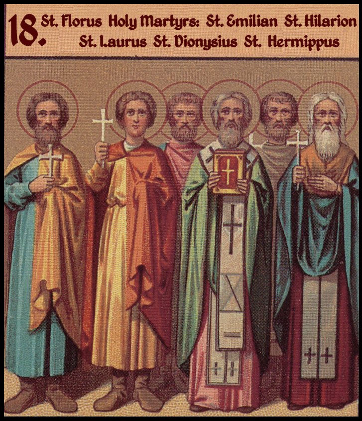 Floro y Lauro eran hermanos en la carne, en espíritu y en vocación. Ambos eran celosos cristianos, y de ocupación, picapedreros. Vivian en Iliria. Un príncipe pagano los contrató para construir un templo a los ídolos. Durante la construcción, sucedió que un trono de piedra cayó y golpeó el ojo del hijo del sacerdote pagano que estaba observando el trabajo de los constructores con curiosidad. Viendo a su hijo ciego y ensangrentado, el sacerdote pagano comenzó a gritar a Floro y a Lauro y quiso golpearles. Entonces, los santos hermanos le dijeron que si creyera en el Dios en el que creían ellos, su hijo se sanaría. El sacerdote aceptó. Floro y Lauro rezaron con lágrimas al Único, Vivo y Señor Dios y trazaron la señal de la cruz sobre el ojo lesionado del hijo. Este se sanó inmediatamente y su ojo volvió a estar como estaba antes. Entonces el sacerdote pagano Merencio y su hijo fueron bautizados y, poco después, ambos sufrieron por Cristo en el fuego. Cuando completaron el templo, Floro y Lauro pusieron una cruz en él, convocaron a todos los cristianos y lo consagraron en nombre del Señor Jesucristo con una vigilia nocturna y cantando himnos. Escuchando esto, el gobernador de Iliria quemó a muchos cristianos y echó a Floro y a Lauro vivos en un pozo y luego lo llenó de tierra. Después, sus reliquias fueron encontradas y llevadas a Constantinopla. Estos dos maravillosos hermanos sufrieron y fueron martirizados por Cristo y fueron glorificados, en el siglo II.